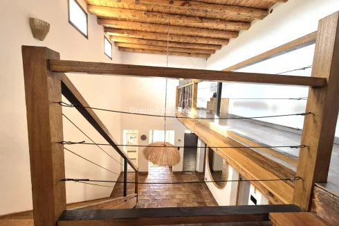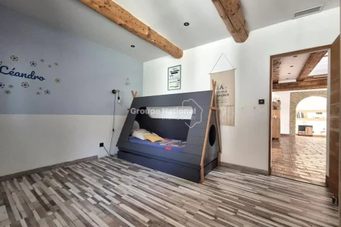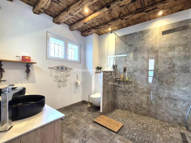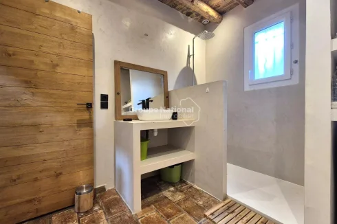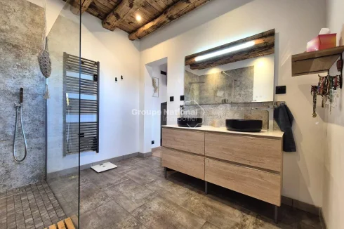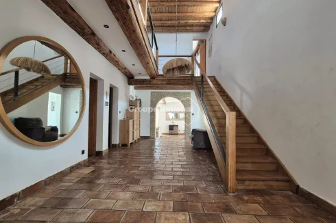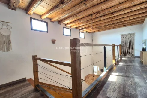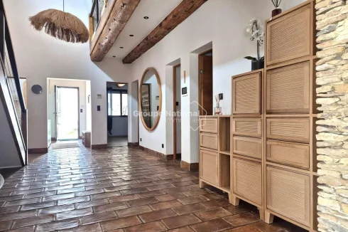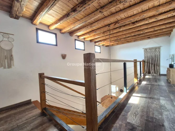 You'll discover a splendid entrance hall with cathedral ceiling, exposed beams and parefeuille flooring, giving access to the first floor where we have a passageway and a master suite with living room, dressing room and shower room.