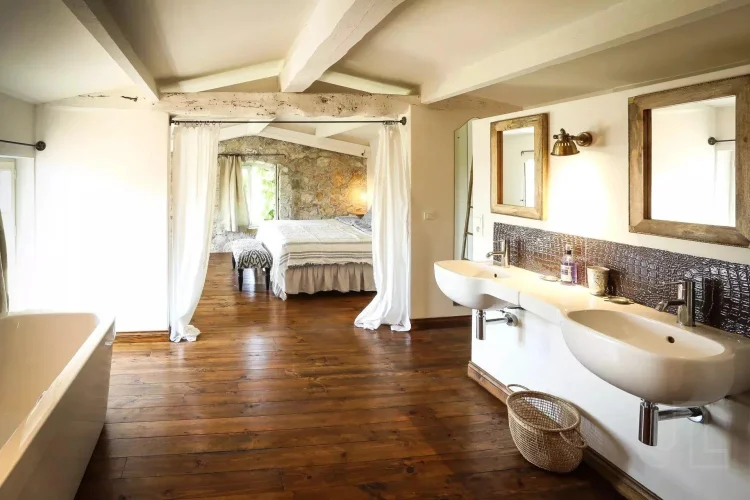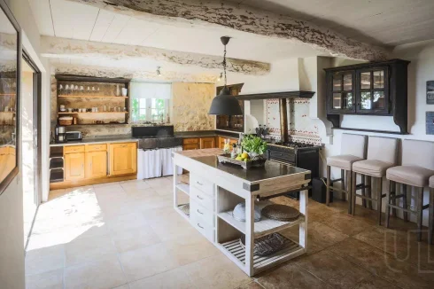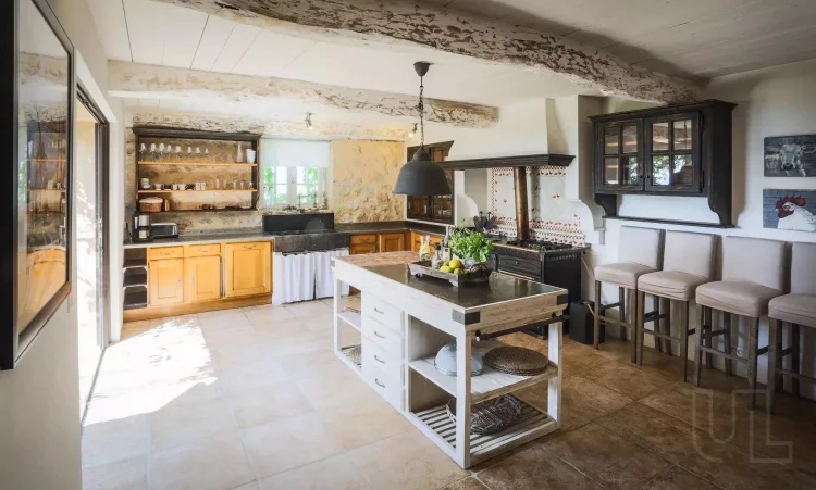 Outside, the Provencal garden is beautifully landscaped with lavender and olive trees, alongside a vegetable garden. A swimming pool complements the outdoor space, while parking is available for several cars.