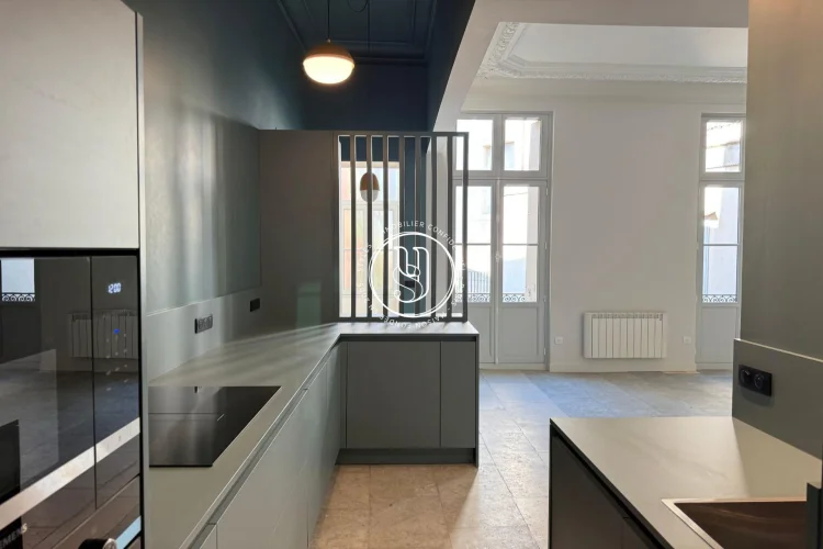 Styles private collection - In the heart of Montpellier& 39 s historic center, in the timeless elegance of an exceptional private mansion, discover this rare property: a fully restored 75 m² apartment, combining old-world charm with modern, high-end amenities. Located on the first floor, this living space opens onto a sumptuous 50 m² terrace, a true extension of the apartment, offering an intimate and refined outdoor space, right in the city center. A unique atmosphere emerges from the entrance, carried by a vast reception room with generous volumes: high ceilings with moldings, a magnificent marble fireplace, and superbly restored floor bars create a setting imbued with authenticity. An elegant, fully equipped kitchen blends seamlessly into the living space. The sleeping area features a light-filled bedroom with carefully sourced antique herringbone parquet flooring and an adjoining shower room with a separate toilet. A former winter garden, subtly renovated, offers an additional room to be imagined according to your desires: a cozy living room, a bright office, an artist& 39 s studio, or a second bedroom. A hallway provides access to the terrace, a suspended haven of peace, which gracefully extends the remarkable architecture of this private mansion. This exceptional property, rare on the market, is complemented by a cellar, ideal for storage or preservation. A confidential and prestigious address, for lovers of elegance, character, and meticulously restored heritage.