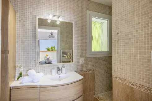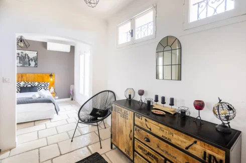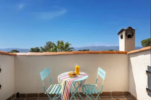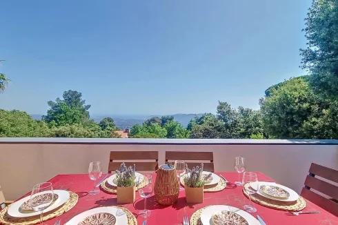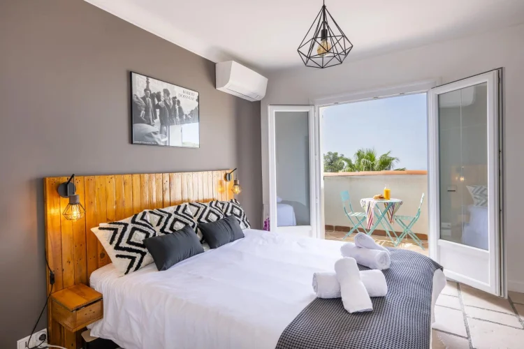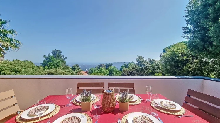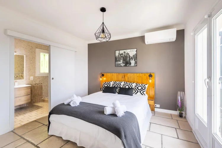 Occupying the first floor, the master suite enjoys complete privacy, with an ensuite shower room, a dressing area with fitted wardrobes, and a private tropézienne terrace offering captivating bird’s-eye views of the sea and the islands beyond Cannes.