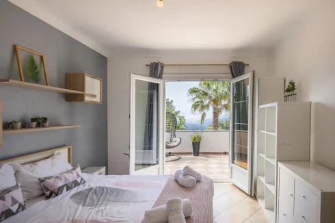 On the ground floor, a bright and spacious living/dining room with a feature fireplace opens onto a sun-soaked terrace overlooking the pool. The open-plan kitchen and separate laundry area provide direct garden access. Three double bedrooms—two with terrace access—along with a bathroom, guest Wc, and walk-in closet complete this level.