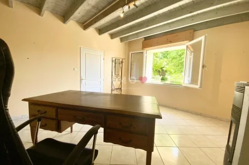 The first floor comprises an entrance hall, a kitchen with freestone fireplace, a cosy dining room, a large, bright living room with Godin stove, an office with a second wood-burning stove, as well as a practical laundry room and storeroom.