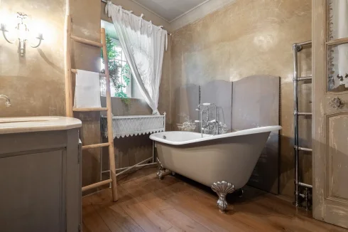 The first floor houses: small room that may serve as an office or child's bedroom spacious principal bedroom with access to an adjoining room, ideal as a dressing area or office additional bedroom bathroom with a classic clawfoot tub, adding a touch of elegance. Beautiful oak wood floors are laid throughout the entire upper floor.