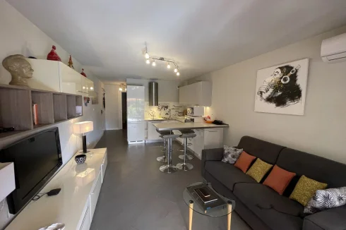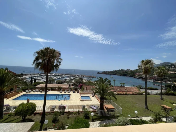 One of the closest apartments to the Figueirette beach on red rocks views and boats view from the sunny South-West terrace. The 37 m² apartment features an entrance hall, a living room/equipped kitchen, a shower room/toilet, a bedroom with storage. Swimming pool. Ideal location. Possibility to buy a double parking in the next residence.