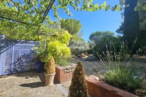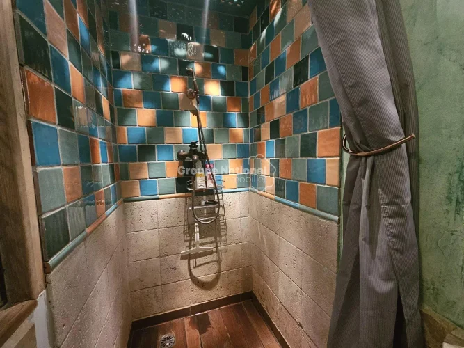 The property is embraced by lush greenery and a quaint fence, adding privacy and a touch of nature to the living experience. The outdoor space is ideal for enjoying leisurely afternoons under the vine-filled pergola, perfect for dining or simply relaxing with a book. The apartment's design harmoniously blends traditional charm with modern comforts, making it a unique and appealing residence for those seeking tranquility.