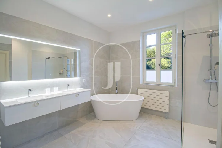 Outside, the garden of over 4,500 m² offers a charming landscaped setting. A spacious terrace, ideal for outdoor dining. The garden includes a 12 x 6 m swimming pool protected by an electric cover. The park features various Mediterranean species: a century-old plane tree, a weeping willow, apple trees, pear trees, fig trees, and more.