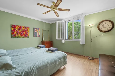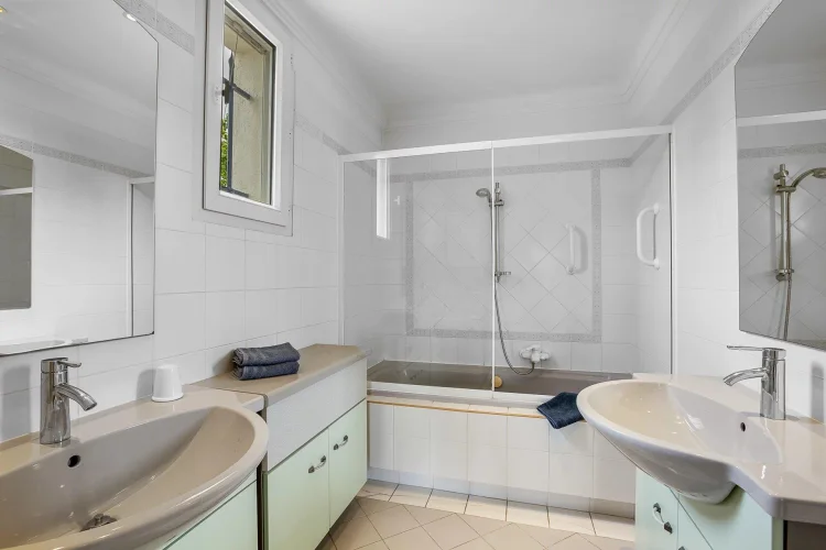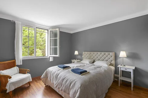 On the same level you will also find: a double garage (35 m²), a laundry room, a fitness room and numerous utility spaces. A wrought-iron staircase leads upstairs, where there are four bedrooms, two bathrooms, a dressing room and a separate toilet. The basement houses a charming wine cellar.