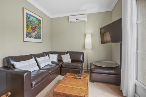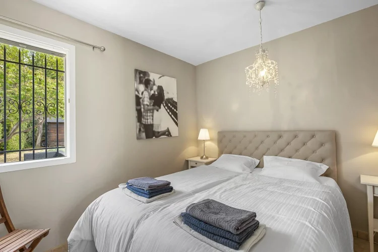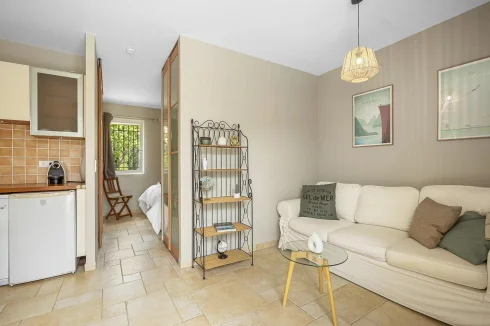The independent apartment, ideally located by the pool, offers a living room with kitchen, a bedroom, a shower room and a separate toilet – perfect for guests or rental.