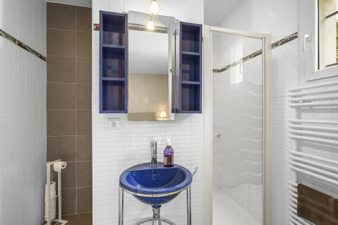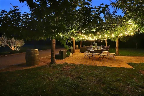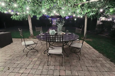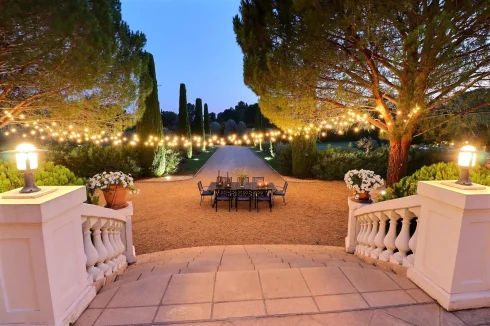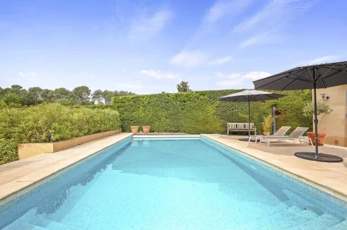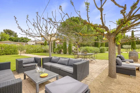The landscaped, fully fenced garden embodies the Provençal lifestyle: a heated saltwater pool with outdoor shower, several terraces for relaxing and dining, a boules court, a volleyball court, and olive trees producing your own oil.