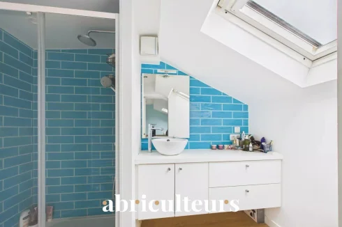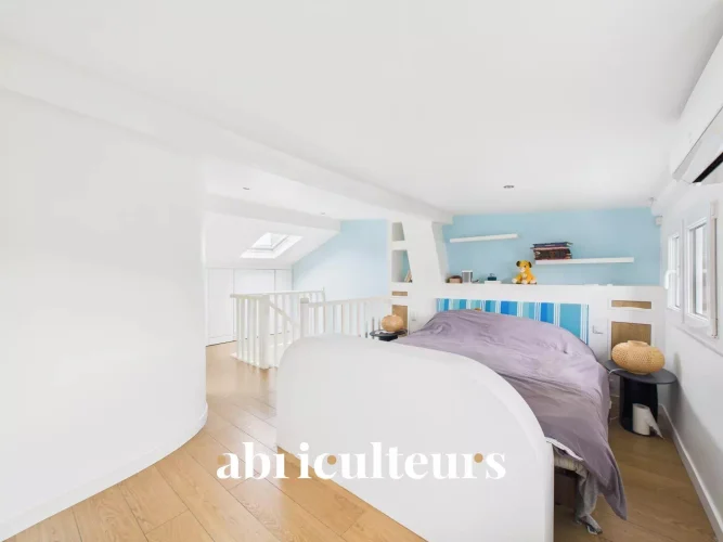 On the second floor, a vast, light-filled living/dining room (38 m²) with bay window and 3 velux windows opens onto a spacious 18 m² fitted kitchen.