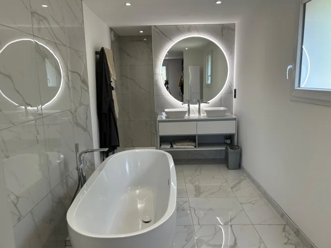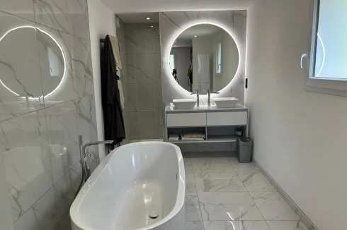 5 minutes north of Auch, new villa of 175 m2 living space with 5 bedrooms on a plot of 1800 m2 in a village with local shops. This villa benefits from a magnificent open living room with fitted kitchen of approximately 70 m2 on the ground floor as well as a laundry room/wc and garage. Upstairs you will find 5 bedrooms including a 38 m2 master suite! The other 4 bedrooms benefit from another bathroom as well as a separate toilet. Excellent Dpe with ducted heat pump heating as well as quality insulation, mains drainage, and immediate proximity to the ring road.