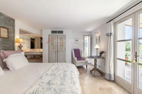 The lower garden level includes three bedrooms, each with its own private shower room and terrace. All rooms offer direct access to the pool area, creating a relaxing and functional outdoor living space.