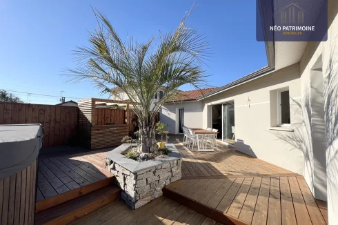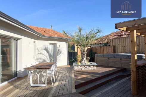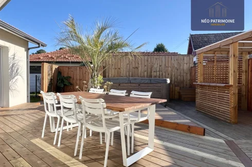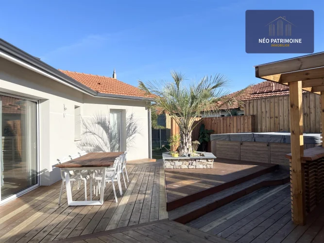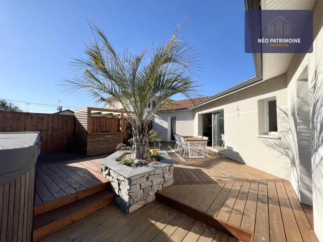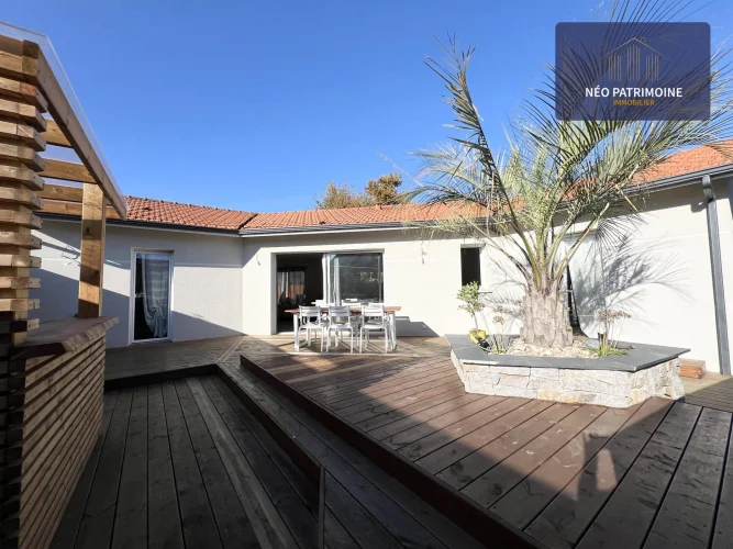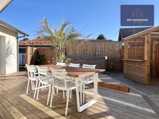 The exterior consists of a garden area to the north with a terrace and its shed of about 10m2, to the south of a large wooden terrace of 100 m² and its summer kitchen.