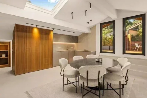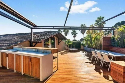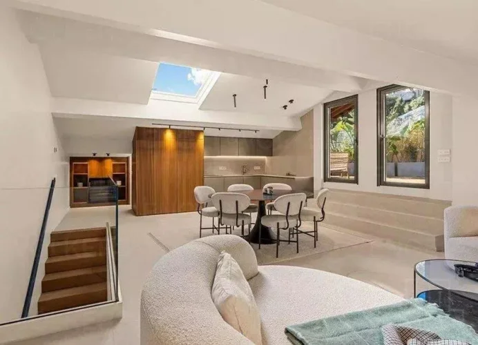 Reminiscent of a small village house, the two-storey residence has been recently renovated with high-quality materials and refined taste. The total living area extends to 118 m², with a Loi Carrez surface area of 101.38 m². The upper level is dedicated to a bright and inviting living room, complete with an open-plan kitchen that flows directly onto a magnificent 77 m² terrace. Bathed in sunlight, this terrace is designed for outdoor living, with a summer kitchen, outdoor shower, elegant pergola and several seating areas surrounded by greenery – the perfect setting for entertaining or quiet relaxation.