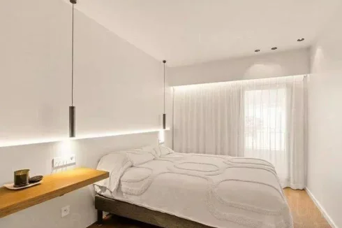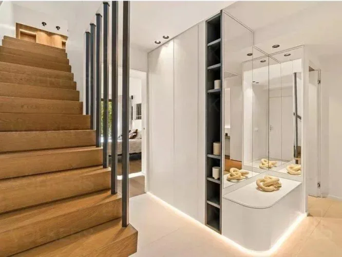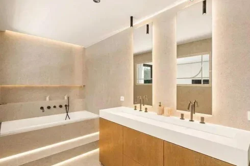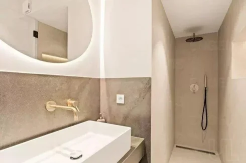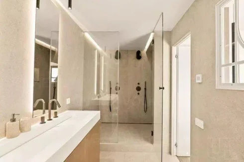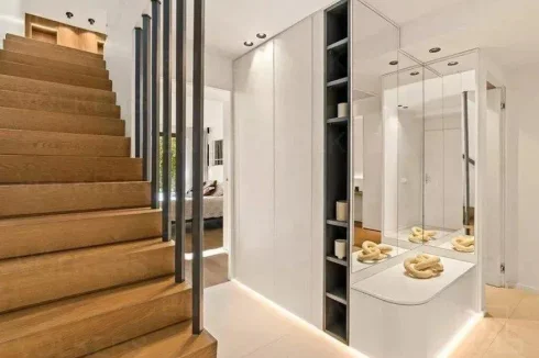 The lower level is dedicated to the sleeping quarters. The spacious master bedroom includes a luxurious en-suite bathroom fitted with both a bath and a shower, along with a large dressing room and a separate toilet. Two additional bedrooms, each with its own en-suite shower room, are situated on the opposite side of the corridor. Every bedroom benefits from direct access to either a terrace or a balcony, enhancing the sense of light and connection to the outdoors.