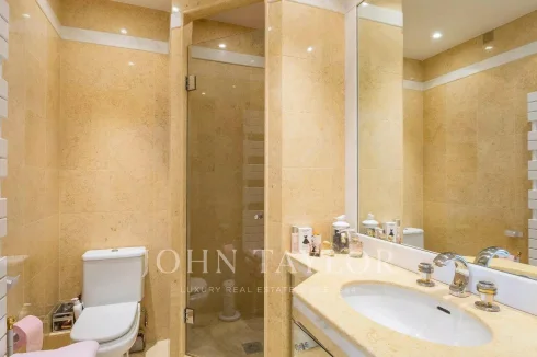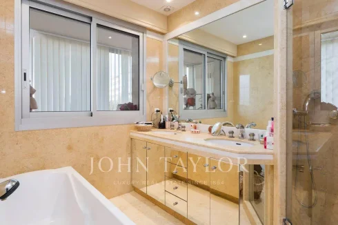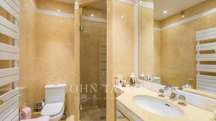 Unique on the first floor, with a private elevator leading directly to the apartment, it comprises four bedrooms, two with sea views and en suite shower rooms, a vast double living room and a separate kitchen.