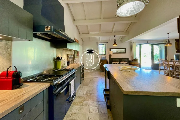 The interior comprises an entrance hall, guest wc, a study (or bedroom) with shower room and a suite for this first part. Next, the cathedral living room, followed by a vast kitchen and dining area, then another vast living room. All these living areas open onto terraces that allow you to vary the pleasures according to the course of the sun. Two further suites (one with bath) with dressing rooms complete the first level. Upstairs, a final suite, like an independent apartment with windows overlooking a superb Provencal panorama, is a real enchantment: Alpilles, olive trees, lavender, fields, nothing is missing...