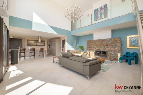 It consists of a large cathedral living room with insert fireplace, a high-end fitted kitchen with central island, 4 bedrooms including a master suite with dressing room and full bathroom, as well as plenty of storage space and functional spaces.