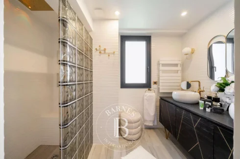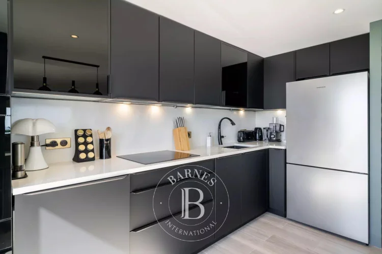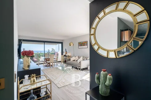 Fully renovated with high-end finishes, it features a bright living room opening onto a sea-view terrace, a semi-open fitted kitchen with access to a second terrace, two bedrooms including a master suite with dressing room, a stylish walk-in shower room, and two separate toilets.