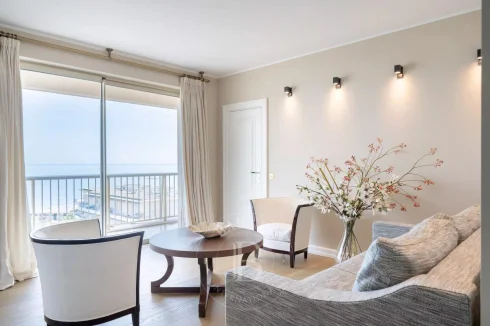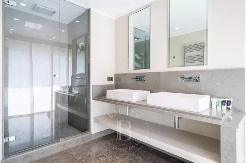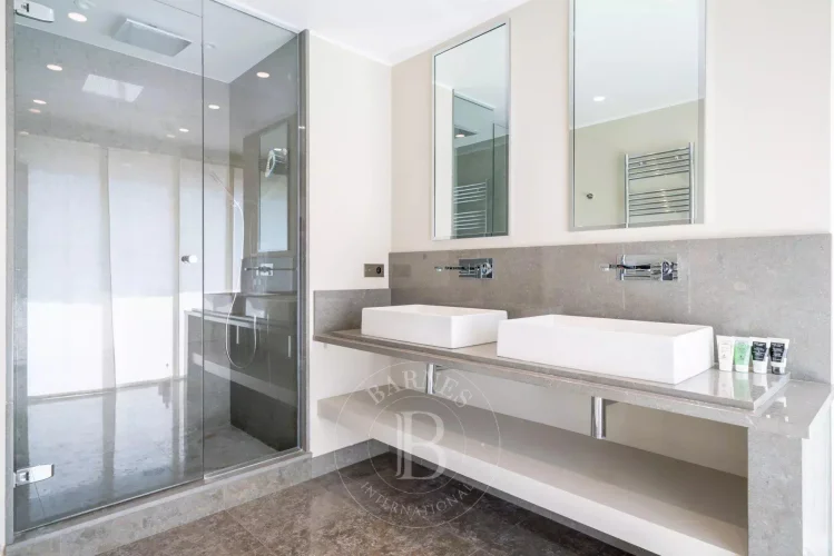 On the first level, the flat has a beautiful entrance hall with direct access to the lift, a large living room with sea views, a fully equipped kitchen, a tea room, dressing rooms and guest Wc.