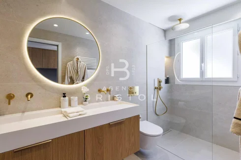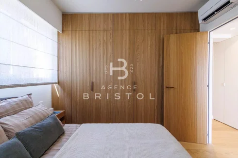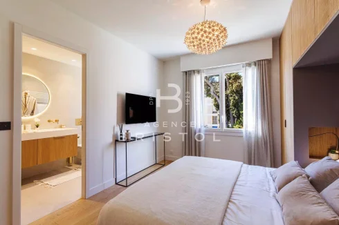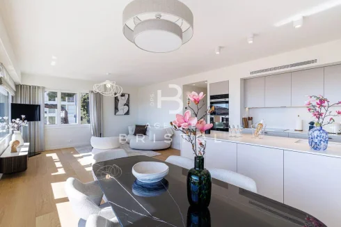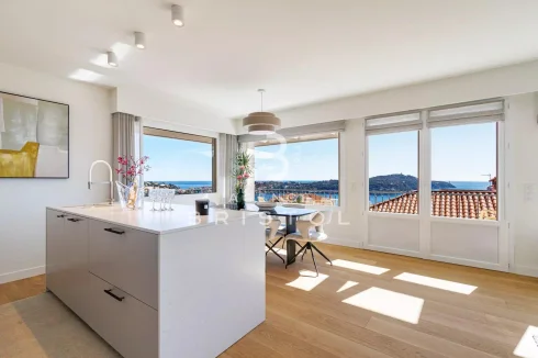 Located in a small, peaceful condominium close to shops, this luxuriously renovated apartment offers a view of the sea and Cap Ferrat.