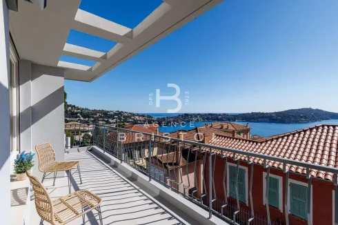 With a living area of almost 100 sqm, this apartment in Villefranche-sur-Mer consists of an entrance, a living room, a fully equipped kitchen, three bedrooms, two shower rooms with toilets, a separate toilet, and a beautiful corner terrace.