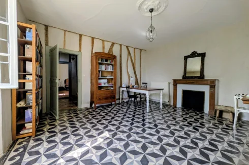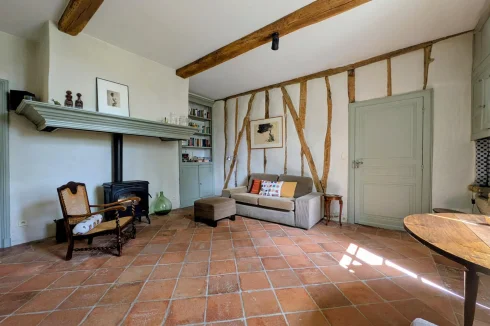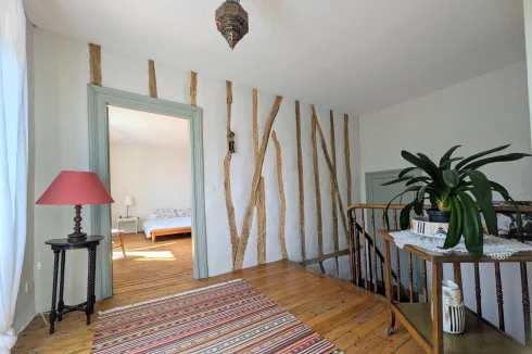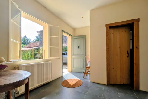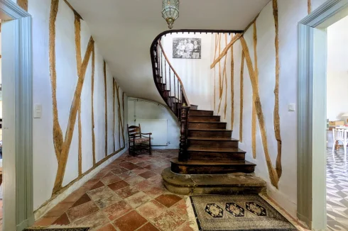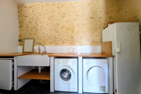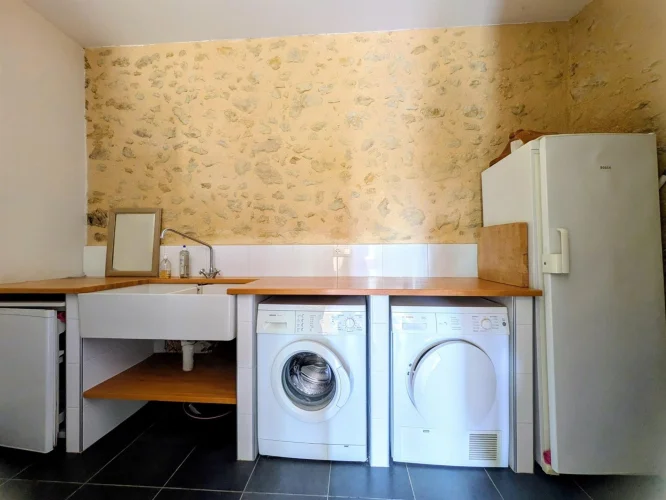 On the ground floor, a large entrance hall leads to the living room with its cement tiles on one side and a dining room with a wood stove on the other. At the back of the house have recently been fitted out a kitchen, a bathroom and a spacious laundry room.