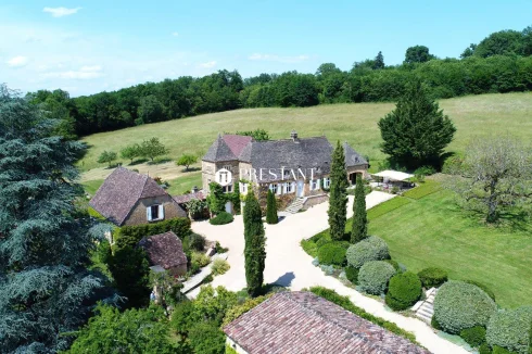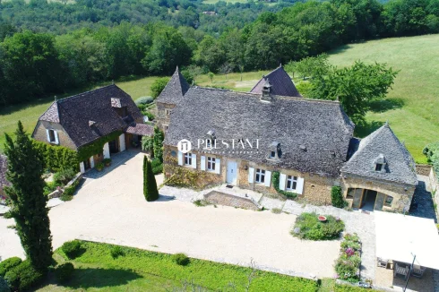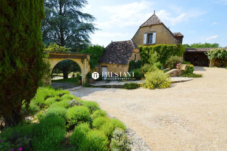 Between Sarlat and Montignac, beautiful 'perigourdine' with stone roofs. About 7.64 hectares (18,87 acres), with views. No pollution. Entrance, sitting room, with fireplace, fitted kitchen, bred oven, outbuildings, 8 bedrooms, 3 bathrooms, garage, pool house, heated pool. Beautiful garden with old trees, vegetable garden & orchard. Suitable to gîte or B&B activities. More information and Virtual Tour on demand. Fees: E 58,020 incl. Vat (3%) payable by the buyer (net price excluding fees: E 966,990). Remaining fees payable by the seller.