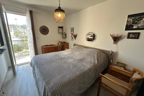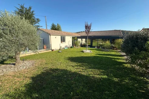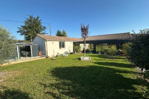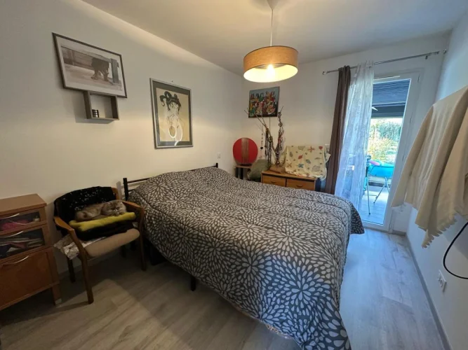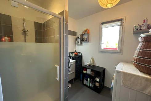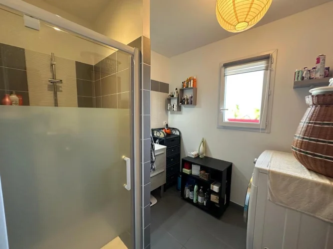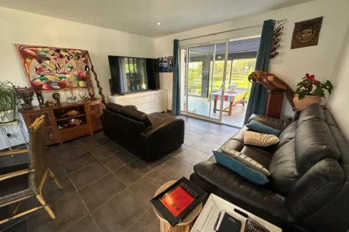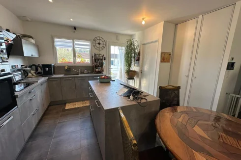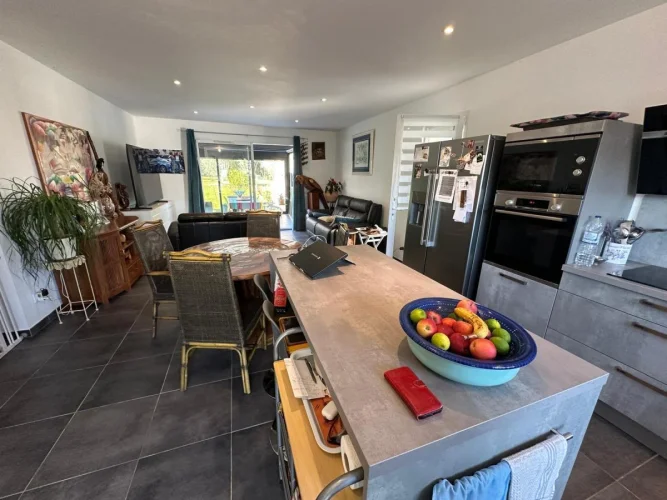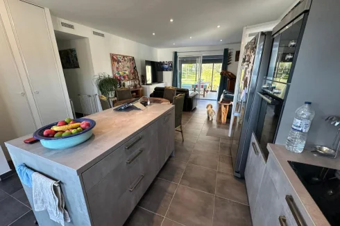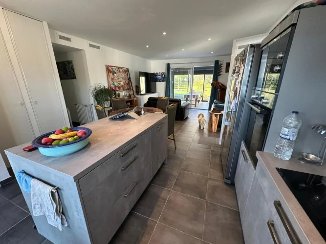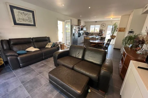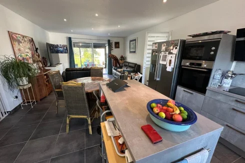 A living room with open kitchen (furnished by Hacker), a toilet, three bedrooms with cupboards and French windows, a shower room, a bioclimatic veranda of 35 m² which complements the 90m² of living space.