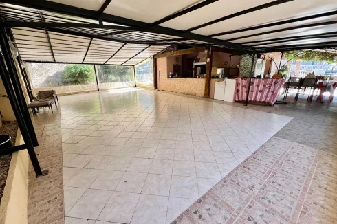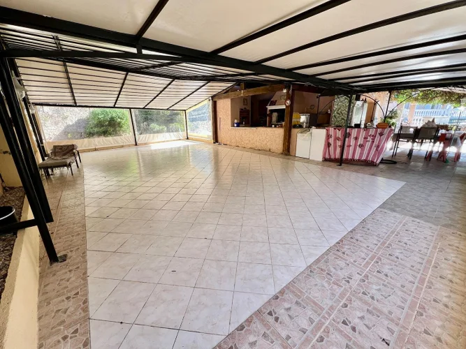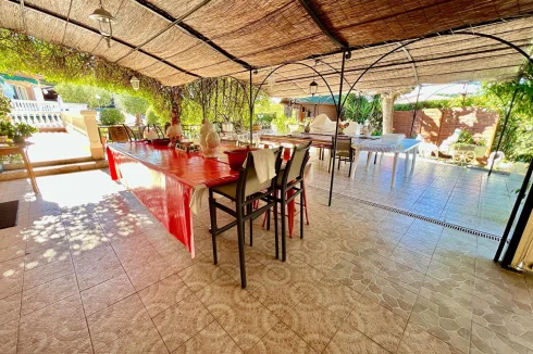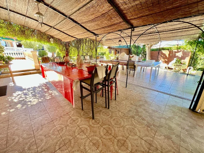 A huge covered terrace of 125 m² with summer kitchen, barbecue and pizza oven, perfect for hosting meals and family parties,