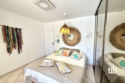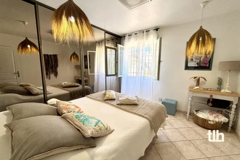 A single-storey villa of 200 m2 of living space on 800 m2 of land. Composed of three bedrooms, two of which have built-in storage and one with dressing room, two bathrooms and two toilets.