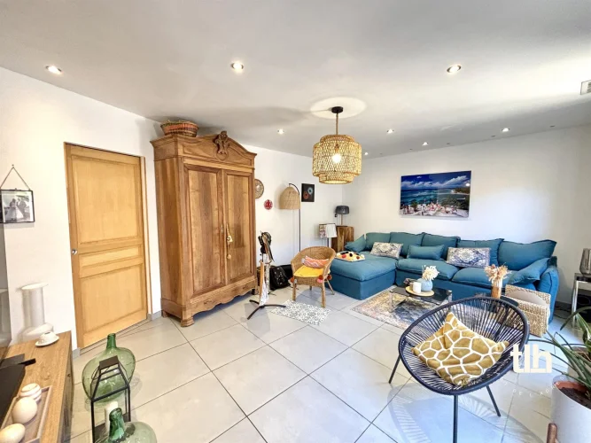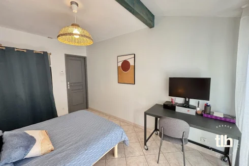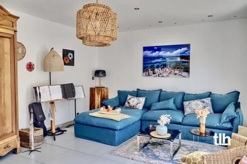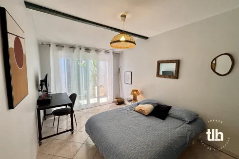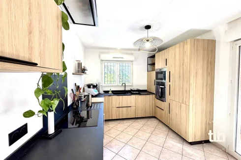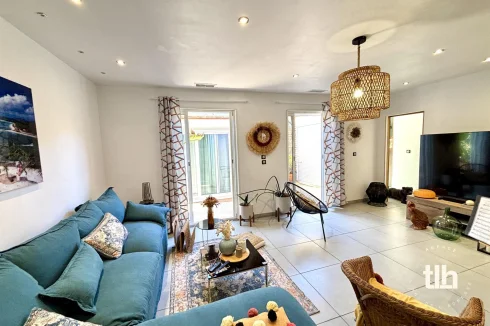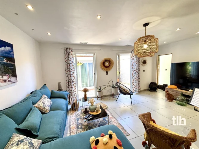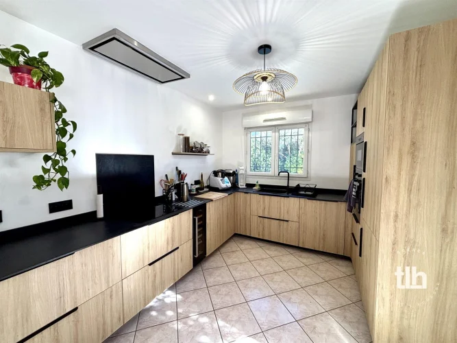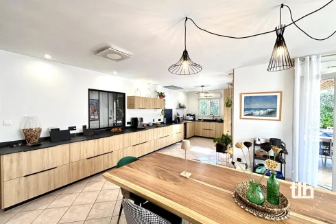 The villa has a kitchen open to the dining room, a very bright space and ideal for convivial meals. You will also find a living room opening onto a bright and wooded patio, two offices, a garage and a storage space or gym above the garage.