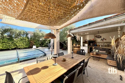 Outside, a covered terrace with fitted kitchen area and an open terrace overlooking an 8.5 × 4.5 metre chlorine filtered swimming pool.