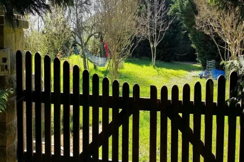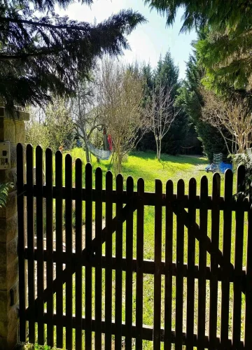 In the garden, a large wooden chalet currently used as a gym.