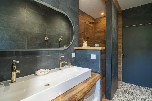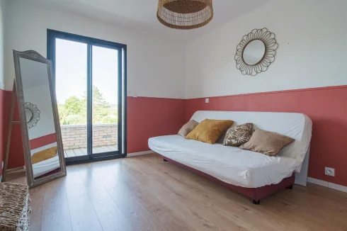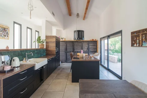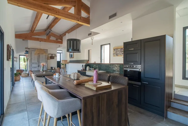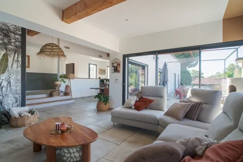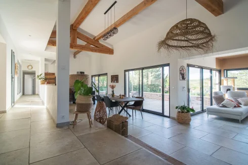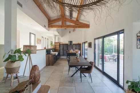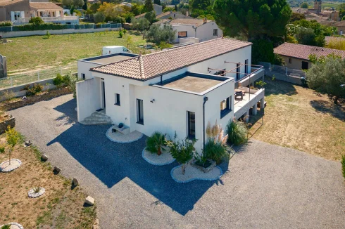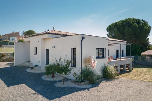 8 minutes from the entrance of Carcassonne, on the heights of the village of Leuc, here is a superb contemporary villa sitting on a landscaped and enclosed plot of 1129m². The villa has an original plan and an elegant, modern silhouette: a central body with a tiled roof and, on either side, two wings with a roof terrace. The house has 162m² and 5 main rooms. From the entrance hall, one is impressed by the magnificent perspective offered by the living room and its cathedral ceiling enhanced by a massive framework, a perspective extended by an overhanging passageway that goes from end to end of the villa and serves the bedrooms and amenities. The 35m² living room-kitchen opens with large bay windows along the entire panoramic terrace and joins the 24m² lounge area which also opens onto the terrace. The whole forms a masterful L-shaped living room on nearly 60m². The kitchen area seduces with its beautifully crafted fittings and equipment at the service of the general elegance of the place. From the passageway overlooking this remarkable living space, the four bedrooms of the villa are adjoined. First, the owner's suite with its beautiful private bathroom with a shower and a dressing room. It is illuminated by a large bay window that opens onto the patio. At the back of the house. 3 other bedrooms with cupboards of 11m², 11.5m², and 12.88m² served by a very beautiful bathroom, reinforce the hospitality of the place. Two toilets, one at the entrance, the other on the bedroom side, and a laundry room, complete the single level. The villa is equipped with double-glazed joinery, a thermodynamic water heater, a heat pump (reversible air conditioning) which give it an excellent thermal balance (rated B and A). Outside, access to the plot is controlled by an automatic gate. The surroundings of the villa are well cared for with an alternation of paths and flowerbeds enhanced in places by an olive tree. The terraces to the south offer a dominant view of the valley and the surroundings. At the back, on the north side, the patio provides its shade and calm for soothing ends of the day. A modern, elegant, and economical villa, which is difficult to resist. And you, will you be able to resist it? For more information, contact us. 3389