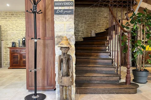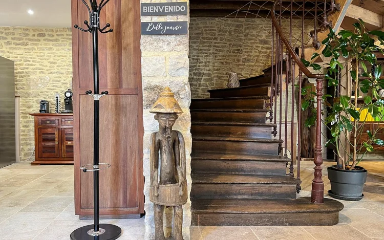 Everywhere, wood and carved stones set the tone. And the decoration, the color. To the right, the living room and the warmth of its insert will comfort lost souls...
