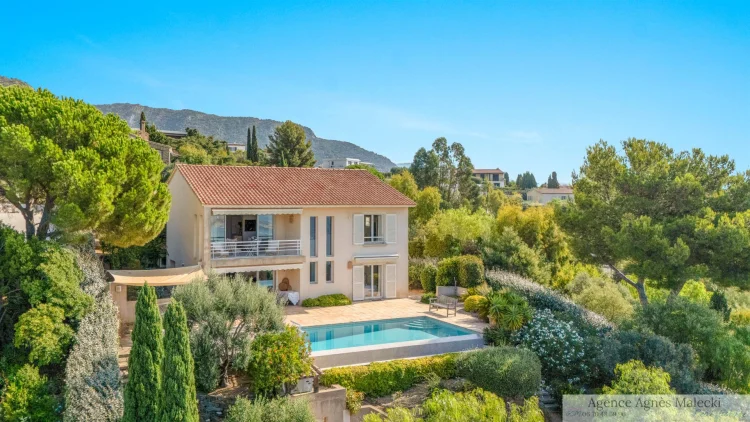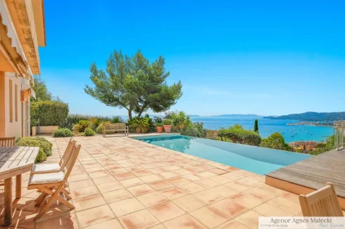 Exclusive To The Agnès Malecki Agency! Overlooking the Mediterranean, this Provençal villa embodies the art of living facing the sea. Here, each opening transforms into a living tableau, revealing the Îles d'Or, the port of Bormes, the legendary Cap Bénat, and the changing lights of Le Lavandou. Built on a 1,230 m2 plot of land planted with Mediterranean trees, the property offers 182 m2 of living space, designed to combine comfort and elegance. On the ground floor, the vast living room extends onto a terrace suspended 190o above the sea, a true belvedere overlooking the horizon. Two bedrooms with their private bathrooms and an office complete this level dedicated to serenity. The garden level, bathed in light, combines a convivial kitchen with a dining room opening onto a large terrace, ideal for summer evenings. Two bedrooms with bathrooms, a laundry room and a cellar provide functionality and comfort. Outside, the infinity pool follows the sea line, offering a feeling of infinity. The wide beaches invite you to relax, while the terraces come alive with the rhythm of the seasons. The landscaped garden, fully planted with trees, envelops the whole in a peaceful and refined atmosphere. A double garage, outdoor parking spaces, a turning area and reversible air conditioning complete the features of this turnkey villa, designed as a rare refuge where luxury combines with discretion. Exclusively With Agence Agnès Malecki! Overlooking the Mediterranean, this Provençal villa perfectly embodies the art of living by the sea. Here, every opening becomes a living canvas, revealing the Îles d'Or, the port of Bormes, the legendary Cap Bénat, and the ever-changing lights of Le Lavandou. Set on a 1,230 m2 plot with Mediterranean essences, the property offers 182 m2 of living space, designed to combine comfort and elegance. On the main level, the vast living area opens onto a 190o terrace suspended above the sea, a true belvedere over the horizon. Two bedrooms with their private bathrooms and an office complete this floor dedicated to serenity. On the garden level, bathed in natural light, a convivial kitchen with dining area opens onto a large terrace, perfect for summer evenings. Two additional bedrooms with bathrooms, a laundry room, and a cellar bring both functionality and comfort. Outdoors, the infinity pool merges seamlessly with the sea, offering a breathtaking sense of endlessness. Expansive lounge areas invite relaxation, while the terraces shift with the rhythm of the seasons. The landscaped garden, fully planted with trees, wraps the property in a refined and peaceful atmosphere. A double garage, outdoor parking spaces, a turnaround area, and reversible air conditioning complete the amenities of this turnkey villa, designed as a rare retreat where luxury meets discretion.