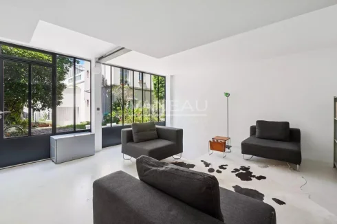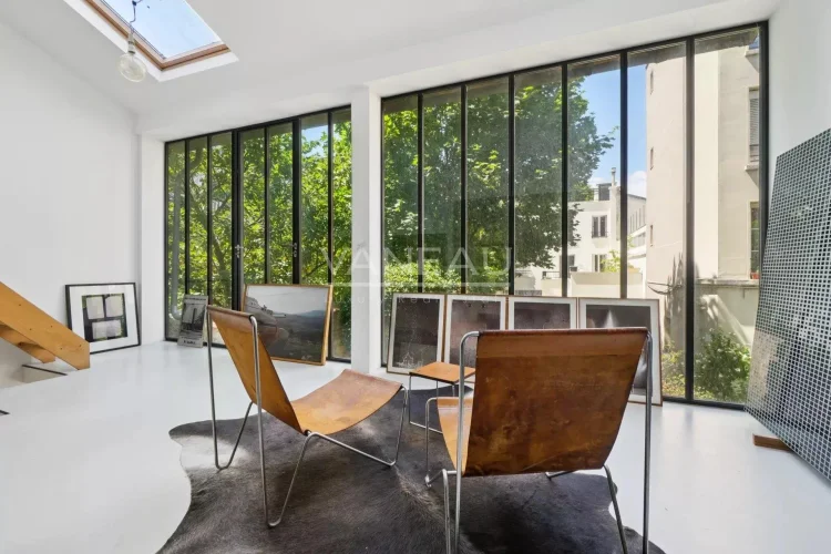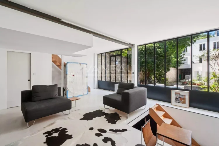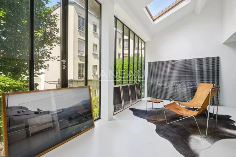 Built on an old vineyard site, a stone's throw from the course of the Bièvre, this architect's house is hidden at the end of a paved courtyard, in a quiet, wooded and perfectly maintained condominium. Secure from the street, it benefits from a privileged location, in the immediate vicinity of the Square René-Le Gall, and is distinguished by its luminosity, its absence of vis-à-vis and the serenity it inspires.