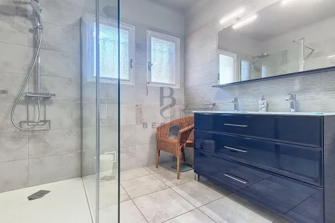 From the entrance, the house hosts a dining room adjoining a large living room. The independent and equipped kitchen opens directly onto a friendly terrace. The sleeping area includes four bedrooms, one of which has a private shower room, an additional renovated shower room and two separate toilets.