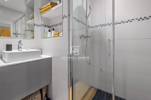 The living room, tastefully designed and bathed in natural light, opens onto a spacious 21 m² fitted terrace — a true extension of the living area — ideal for enjoying the Mediterranean climate in refined surroundings.