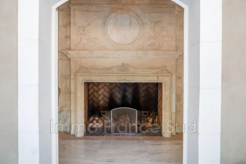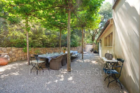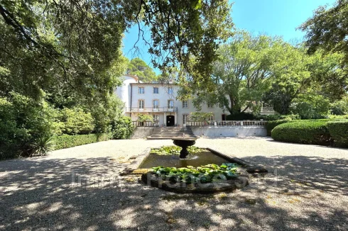 The 13-hectare estate includes 8 hectares of woodland, 5 hectares of landscaped grounds, and an adjacent classified vineyard. A romantic fountain, stone staircase, and mature pines enhance the timeless beauty of the setting.