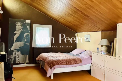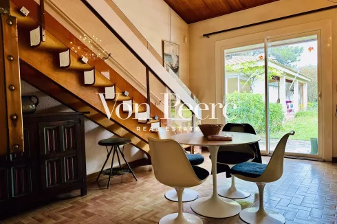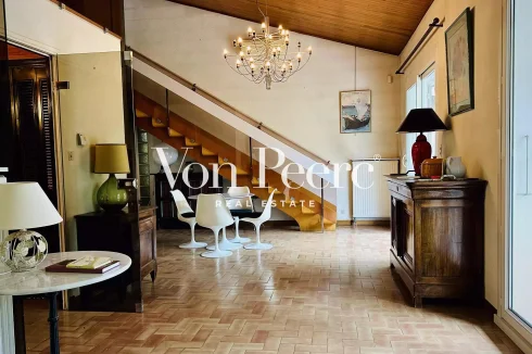It offers beautiful volumes with a large living room featuring a 1970s fireplace, overlooked by a generous mezzanine that could accommodate an office, library, or private lounge.