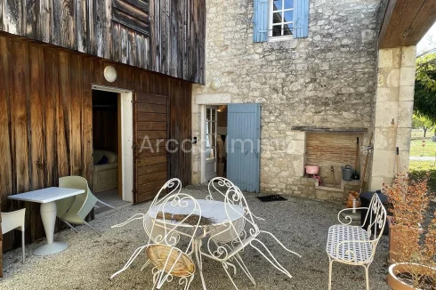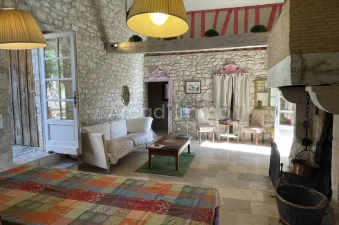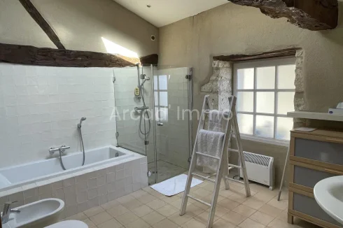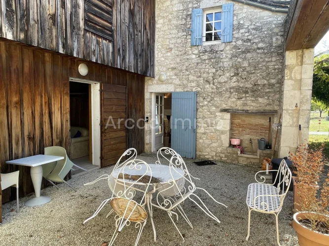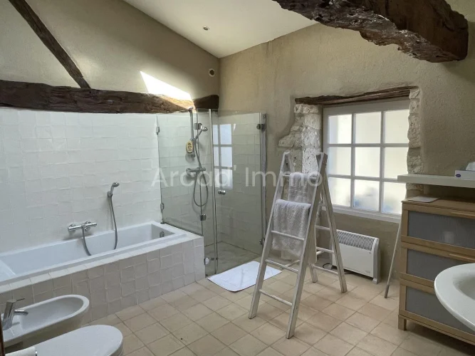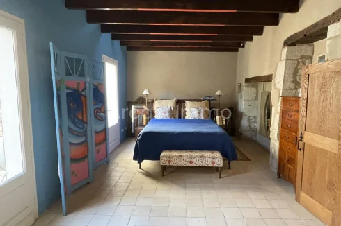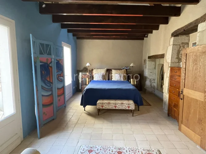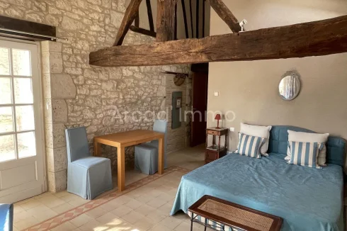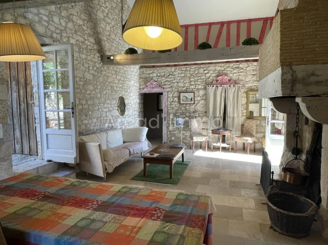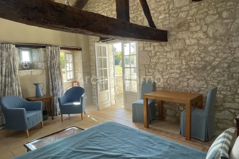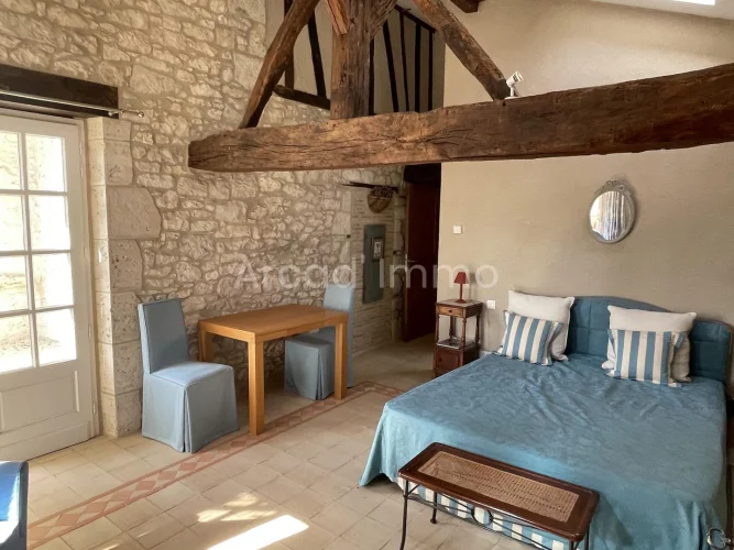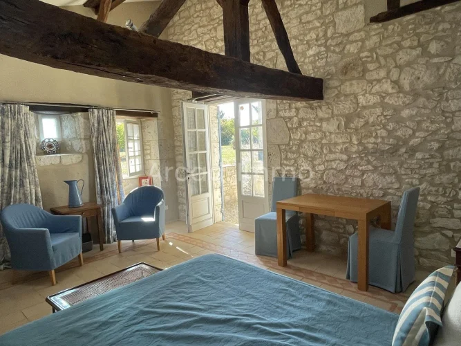 The small porch / entrance to the property. The lounge/dining room (33.35 m2) with its open fireplace and imposing oak beam exposed stone walls, ceiling beams and a half-timbered wall, electric underfloor heating, double glazed wooden windows and wooden shutters, high ceilings. The kitchen (12 m2) is on the ground floor of the Pigeonnier stone walls, underfloor heating, travertine, double glazed door with shutter leading to the inner courtyard, oak ceiling beams. The mezzanine (14 m2) is above the dining area, oak wooden floor, access via a winding staircase, view from the mezzanine into the living room, an ideal place to set up an office or your library. The hallway/storage area. The master bedroom with its private access under the small porch at the entrance. This is a beautiful and spacious room with a sloping ceiling with two velux windows, electric underfloor heating and exposed stone walls. The bathroom in this room is very spacious and bright, with a large velux ceiling and glass brick window, bath and walk-in shower, wall-hung Wc and bidet, and a beautiful washbasin to complete the room. In the corridor is also the laundry room (3.5 m2) with the connection for the washing machine/dryer, a hot water tank and the electrical panel. The shower room with guest toilet (3.4 m2) is beautifully finished with a walk-in shower. The second bedroom (25.2 m2) with its access to the inner courtyard, is a very spacious room with exposed beams from an old hayloft as it used to be the cow barn. On the first floor in the Pigeonnier is the third bedroom, (12 m2) with of course a superb frame, stone walls and solid oak floor, a washbasin has been installed, the chimney in the kitchen is superb. This small property was renovated in 2002 by good craftsmanship with quality materials. It is ready to move in, without any work. Living space (approx. 134 m2), connection to a functioning cesspool, electric underfloor heating. There is a courtyard, partly grass and partly white gravel, which is a real pleasure all year round as it is south facing. The plot of 1200 m2 is on the other side of the small communal road, remember, the property is in a small hamlet and so there is a small road to get in and out and so there are a few neighbours. On the land you can install a swimming pool, a garden shed, a pétanque court, and even create your own vegetable garden and orchard.