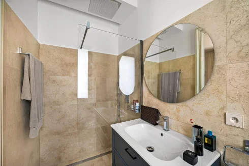 The villa is organized over two main levels and also includes an independent apartment. On the ground floor, a welcoming entrance leads to a fully equipped kitchen, perfect for entertaining, and to a spacious 80-square-meter terrace offering breathtaking views of the sea and the surrounding landscape. This level also features two bedrooms, two bathrooms, and a walk-in closet, blending functionality and sophistication.