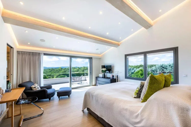 The villa provides five generously sized bedrooms and five bathrooms. Among them is a versatile suite designed to function as an independent apartment or studio, ideal for accommodating guests, extended family or staff. The principal bedroom is a true retreat, boasting a private terrace with magnificent views.