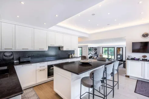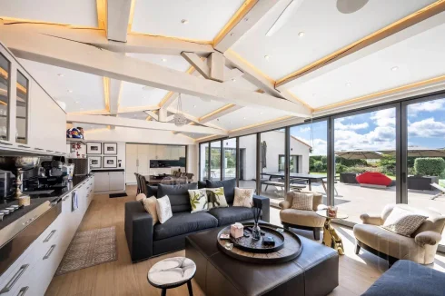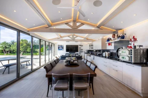 With approximately 350 m² of living space arranged over two levels, the villa has been conceived to maximise both light and space. The entrance hall leads into a bright and expansive double living room, which flows effortlessly into a contemporary kitchen complete with a breakfast bar. Adjoining this, a vast open-plan area with striking high beams and floor-to-ceiling sliding glass doors integrates a kitchen, dining and lounge space. This light-filled room opens directly onto the landscaped garden, where multiple al fresco seating areas and summer dining terraces offer a seamless transition between indoor and outdoor living.