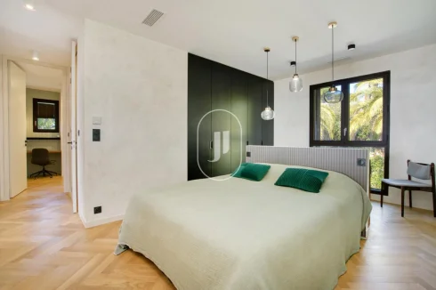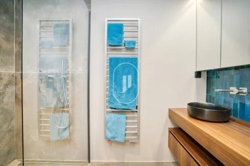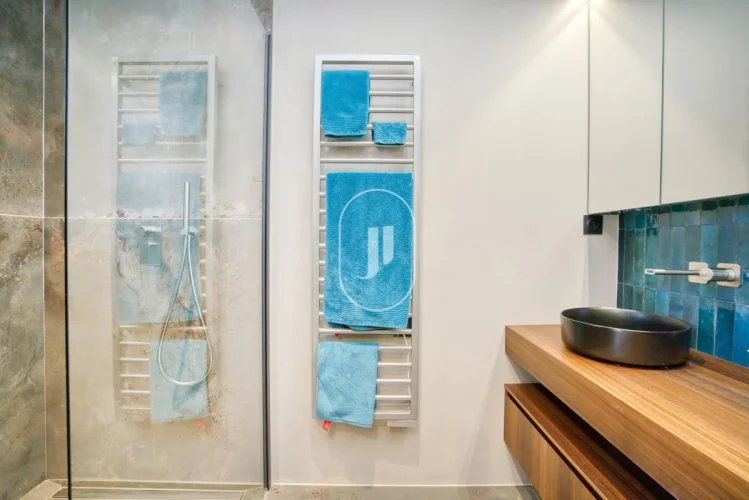 Three bedrooms, each designed as a private suite: two beautiful bedrooms with private shower room and built-in cupboards, one having direct access to the terrace a spectacular third bedroom looking straight out at the sea through a glass partition, with an office nook discreetly installed behind the bedhead and a custom-made walk-in wardrobe.