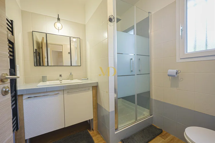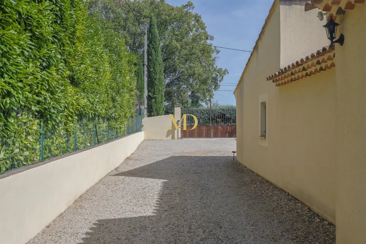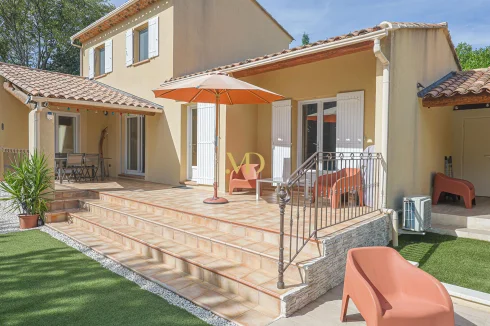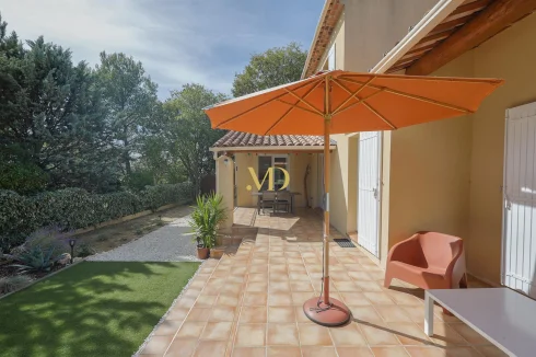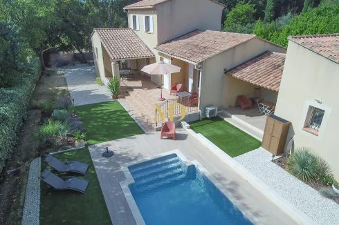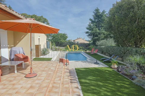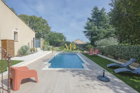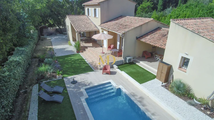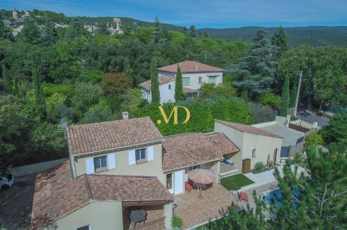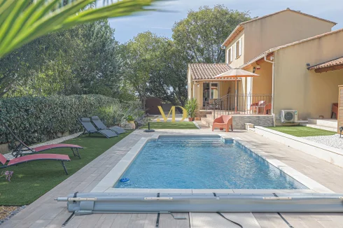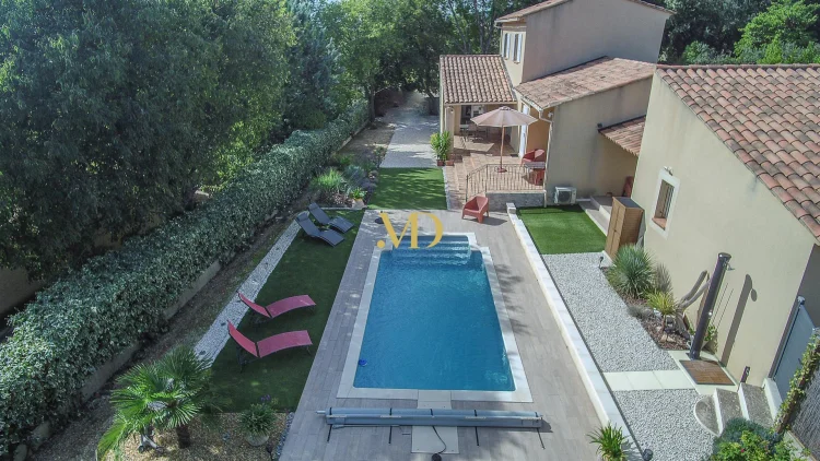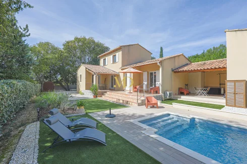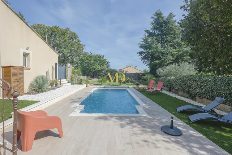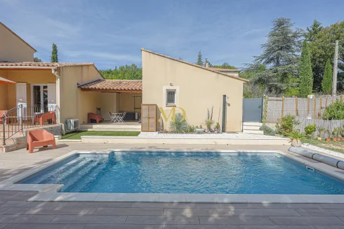 Exclusive Maison Dumon presents for sale: Just 300 meters on foot from the charming village of Saint Saturnin lès Apt, this house of 126 m2 in total, located on an enclosed and landscaped plot of 1034 m2, offers a living environment combining modern comfort and authenticity. On the ground floor, an entrance hall with storage, a guest toilet, an en-suite bedroom with a dressing room and private bathroom, giving access to the terrace area. A bright living room with a lounge and dining room, a separate, fitted kitchen with its back kitchen. Upstairs, two bedrooms with built-in wardrobes share a shower room with Wc. Outside, an automatic gate opens onto a wooded and meticulously maintained garden. The heated and secure swimming pool invites relaxation, while the terraces pleasantly extend the reception areas. A 23 m2 garage with a mezzanine completes this beautiful property. Comfort and Services: underfloor heating on the ground floor - reversible air conditioning - double-glazed Pvc joinery - optical fiber - connection to the sewer network - chimney flue available - automated gate - alarm. This perfectly cared for and maintained house is a rare opportunity on the market which perfectly combines proximity to the village and peace and quiet. Information on the risks to which this property is exposed is available on the Géorisques website: