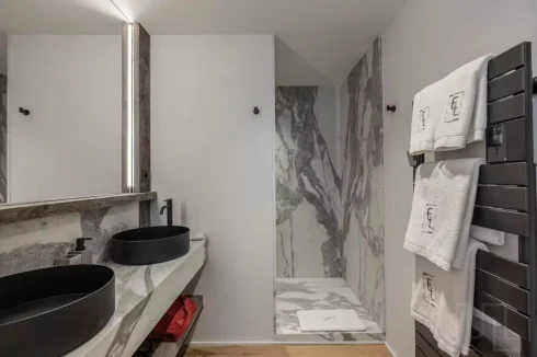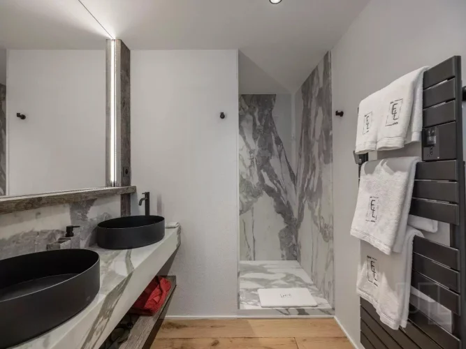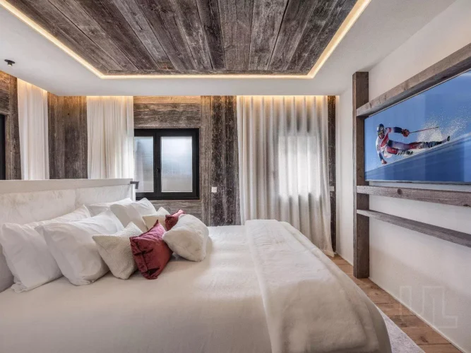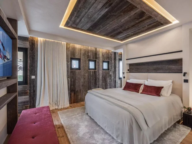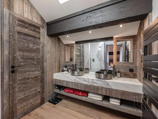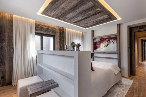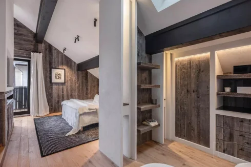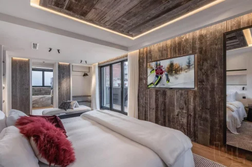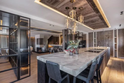 With its timeless modern architecture, the chalet showcases a harmonious combination of clean lines and noble materials, creating a refined yet welcoming atmosphere. Inside, the space has been thoughtfully designed across four levels, each detail carefully considered to elevate everyday living. The top floor features a generous 41 sq.m living room with a cosy library corner and access to a large terrace, perfect for soaking up panoramic mountain views. Just below, a stunning master suite occupies its own level, complete with a private lounge area, ample built-in storage, and access to a spacious balcony. This floor also houses an elegant reception room with a dining area, a wine cellar, and a sleek open kitchen with a bar tailored for both entertaining and daily life.