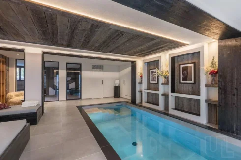On the first floor, you’ll find three beautifully appointed en suite double bedrooms with shower rooms, as well as a fourth double bedroom that includes both a bath and a shower. A guest toilet and a laundry room are also located on this level for added practicality. At the chalet’s entrance level, convenience meets indulgence with a double garage, a hallway leading to a well-equipped ski room, a separate toilet, and a technical room. The highlight, however, is the luxurious wellness area—complete with an indoor swimming pool, hammam, and a relaxation zone that offers year-round serenity. A dedicated sports room completes this level, allowing for fitness and leisure without ever leaving the comfort of home.